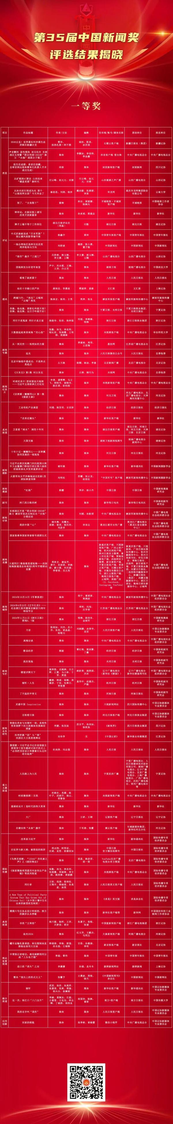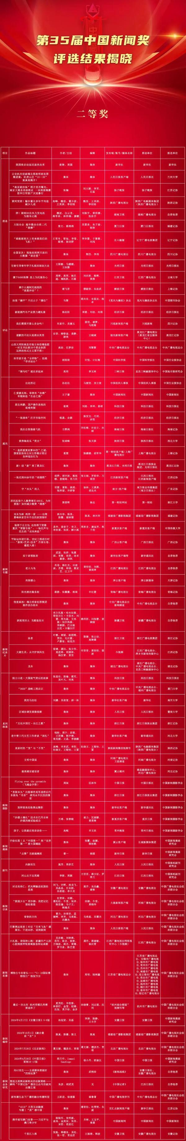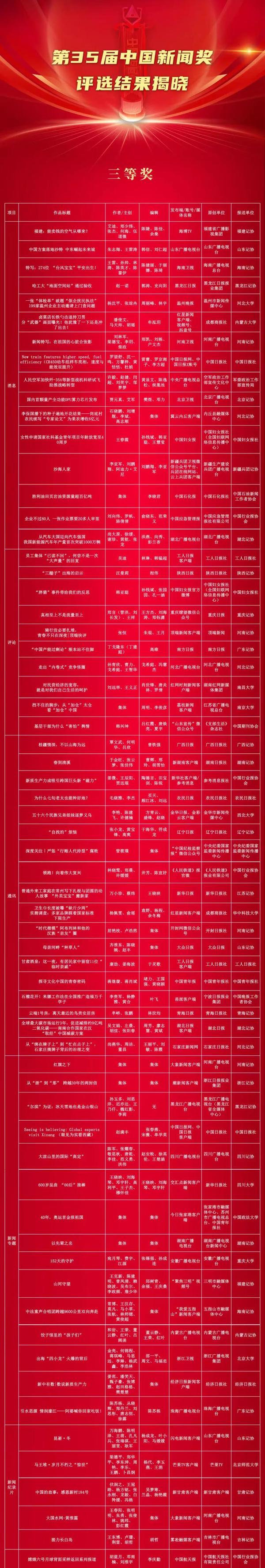 由中华全国新闻工作者协会主办的第35届中国新闻奖评选结果于11月5日揭晓。来自各级各类媒体的377件作品获中国新闻奖,其中,特别奖4件、一等奖74件、二等奖113件、三等奖186件。